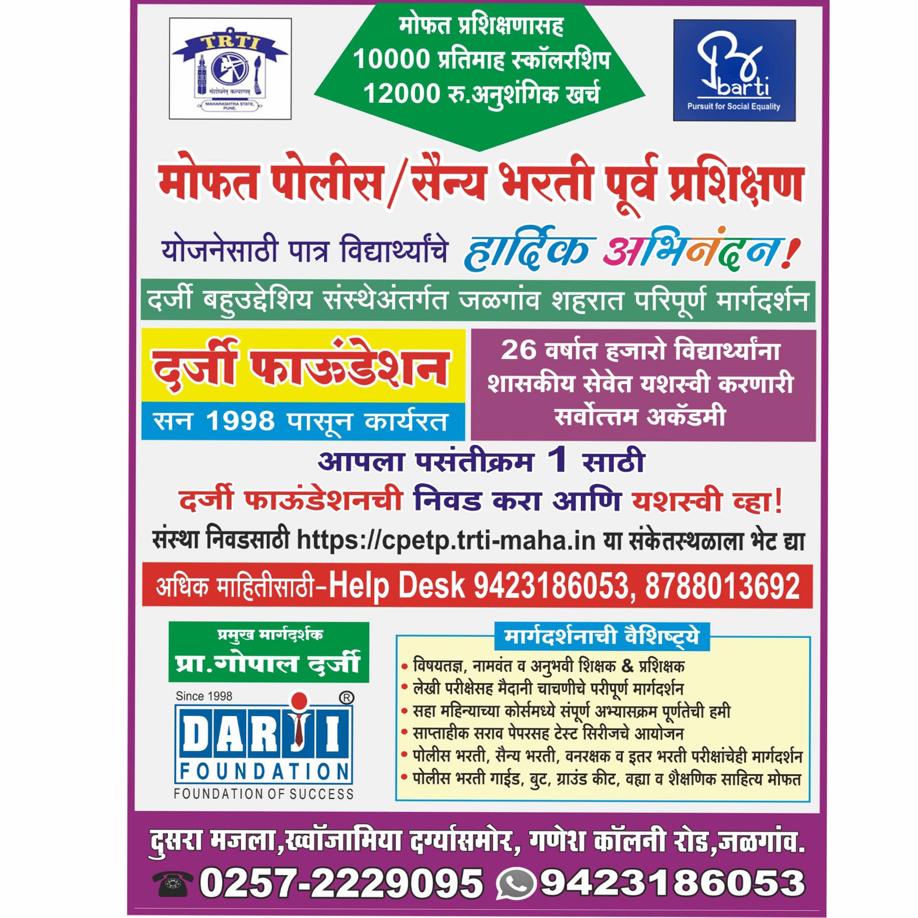 BARTI आणि TRTI अंतर्गत अनुसूचित जाती व जमातीच्या विद्यार्थ्यांकरिता पोलीस भरती प्रशिक्षणासाठी निवड झालेल्या विद्यार्थ्यांचे हार्दिक..अभिनंदन... पोलीस भरती आणि सैन्य भरतीच्या परिपूर्ण प्रशिक्षणासाठी दर्जी फाऊंडेशनची निवड करा आणि यशस्वी व्हा! BARTI आणि TRTI अंतर्गत राबविण्यात येणाऱ्या प्रशिक्षण योजनेसाठी संपूर्ण महाराष्ट्रातील विद्यार्थी पोलीस भरती प्रशिक्षणासाठी दर्जी फाऊंडेशनची निवड करू शकतात. ✍ महाराष्ट्र शासनातर्फे TRTI आणि BARTI अंतर्गत पोलीस भरती आणि सैन्य भरती मोफत प्रशिक्षण योजनेसाठी अधिकृत संस्था म्हणून जळगाव येथील दर्जी फाऊंडेशनची निवड झालेली आहे संचालक प्रा. गोपाल दर्जी 🖋️ प्रशिक्षण ठिकाण - दर्जी फाऊंडेशन, दुसरा मजला, ख्वाजामिया दर्ग्यासमोर, गणेश कॉलनी रोड, जळगाव 🔹 महाराष्ट्रातील कोणत्याही जिल्ह्यातील विद्यार्थी दर्जी फाऊंडेशन या संस्थेची निवड करू शकतात. 🔹 संस्था निवडसाठी https://cpetp.trti-maha.in या लिंकवर क्लिक करा ✍ प्रशिक्षण कालावधी 6 महिने असून विद्यार्थ्यांना मोफत प्रशिक्षणासह.(लेखी व मैदानी चाचणी प्रशिक्षण ) शासनाकडून एकूण 60000 स्कॉलरशिप व 12000 रुपये शैक्षणिक खर्च मिळणार आहे. आधिक माहितीसाठी HELP DESK 📞 9423186053 , 8788013692 किंवा खालील गुगल लिंकवर क्लिक करून फार्म भरून द्या https://docs.google.com/forms/d/e/1FAIpQLSdCw2wi_kQauYF0koitDa_wO-GAvYWidRx-vgopTJqxOB7eMg/viewform?usp=sharing